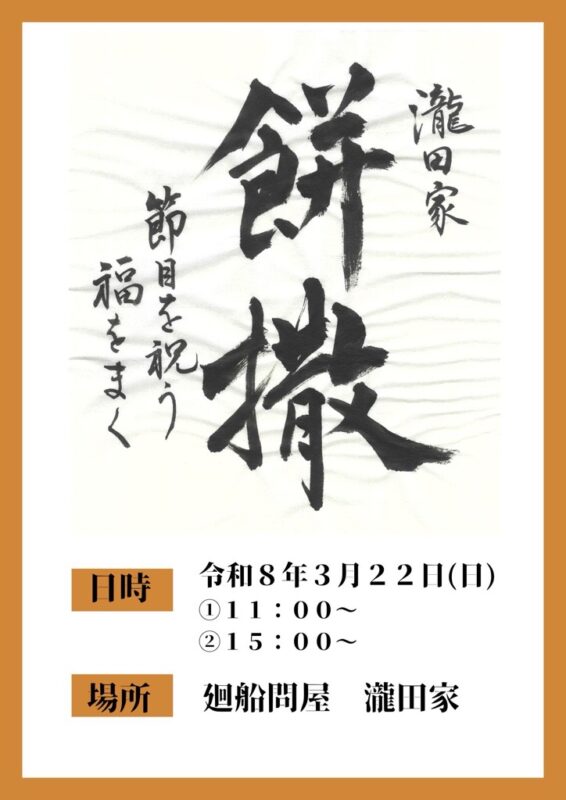 歴史ある廻船問屋瀧田家にて、新たな年中行事となる餅まきイベント「福まきの儀」を開催いたします。福女(女性代表)が福まき衣をまとい、そのはじまりの一日を、ぜひご家族でご参加ください。